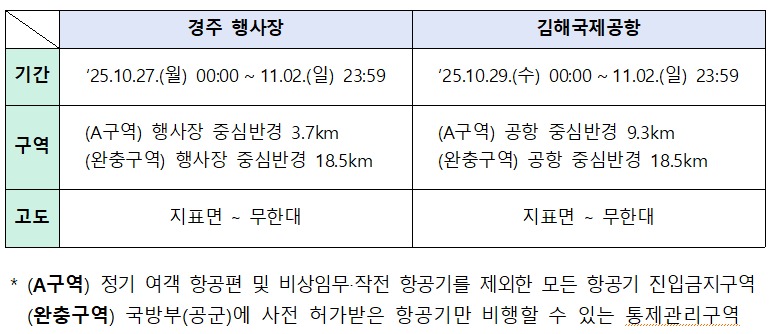 다만 정기 여객 항공편, 응급구조·재난 대응·군경 작전 등 비상임무 항공기는 예외적으로 운항이 허용된다.