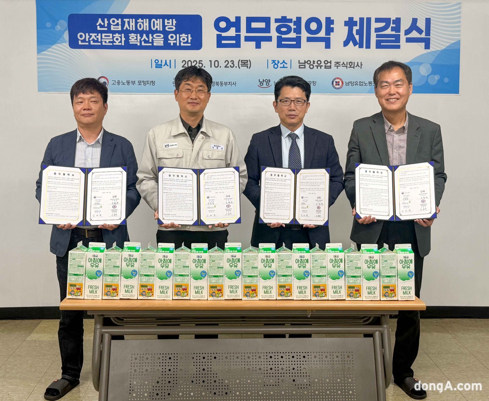 남양유업은 지난 23일 경주공장에서 고용노동부, 한국산업안전보건공단과 안전문화 확산 업무협약을 체결했다고 24일 밝혔다. 왼쪽부터 이동백 남양유업노동조합 경주부지부장, 조현상 남양유업 경주공장장, 신동술 고용노동부 포항지청장, 김태완 안전보건공단 경북동부지사장. |