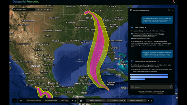 이번 업데이트에는 다양한 어스 AI 모델을 연결하여 복잡한 질문에 답할 수 있는 새로운 지리적 추론 도구가 포함된다. 특히 제미나이 기반 AI 도구가 추가되어, 사용자가 모델에 직접 질문을 던져 폭풍 상륙 예측, 홍수 조기 경고 등 기후 관련 정보를 몇 분 안에 신속하게 얻을 수 있다.