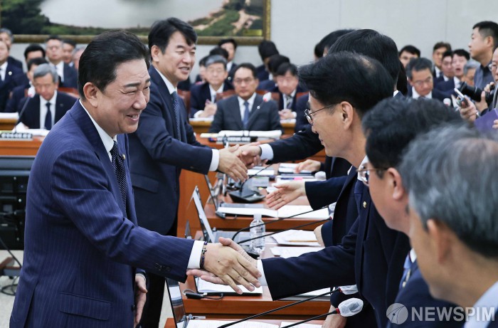 [서울=뉴스핌] 윤창빈 기자 = 김병기 더불어민주당 원내대표, 문진석 원내운영수석부대표가 24일 오전 서울 여의도 국회에서 열린 농림축산해양수산위원회의 농업협동조합중앙회 등에 대한 국정감사에서 민주당 의원들과 인사를 나누고 있다. 2025.10.24 pangbin@newspim.com