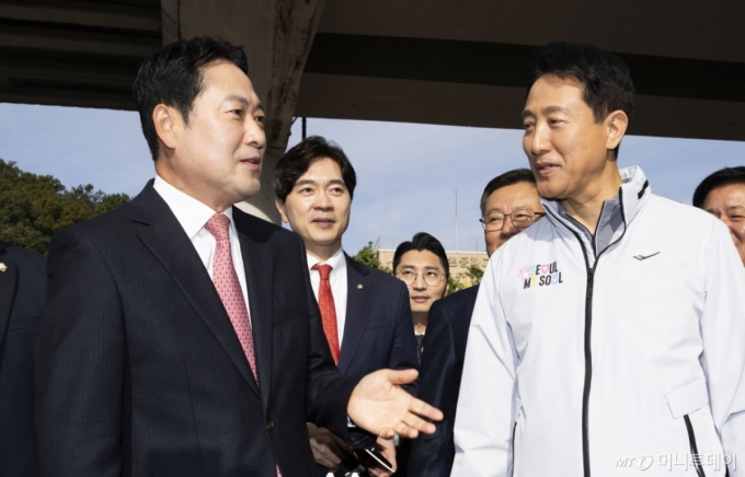 (서울=뉴스1) 오대일 기자 = 장동혁 국민의힘 대표와 오세훈 서울시장이 24일 오전 서울 노원구 상계5 재정비촉진구역 현장점검에 앞서 인사를 나누고 있다. (공동취재) 2025.10.24/뉴스1 Copyright (C) 뉴스1. All rights reserved. 무단 전재 및 재배포, AI학습 이용 금지. /사진=(서울=뉴스1) 오대일 기자 |