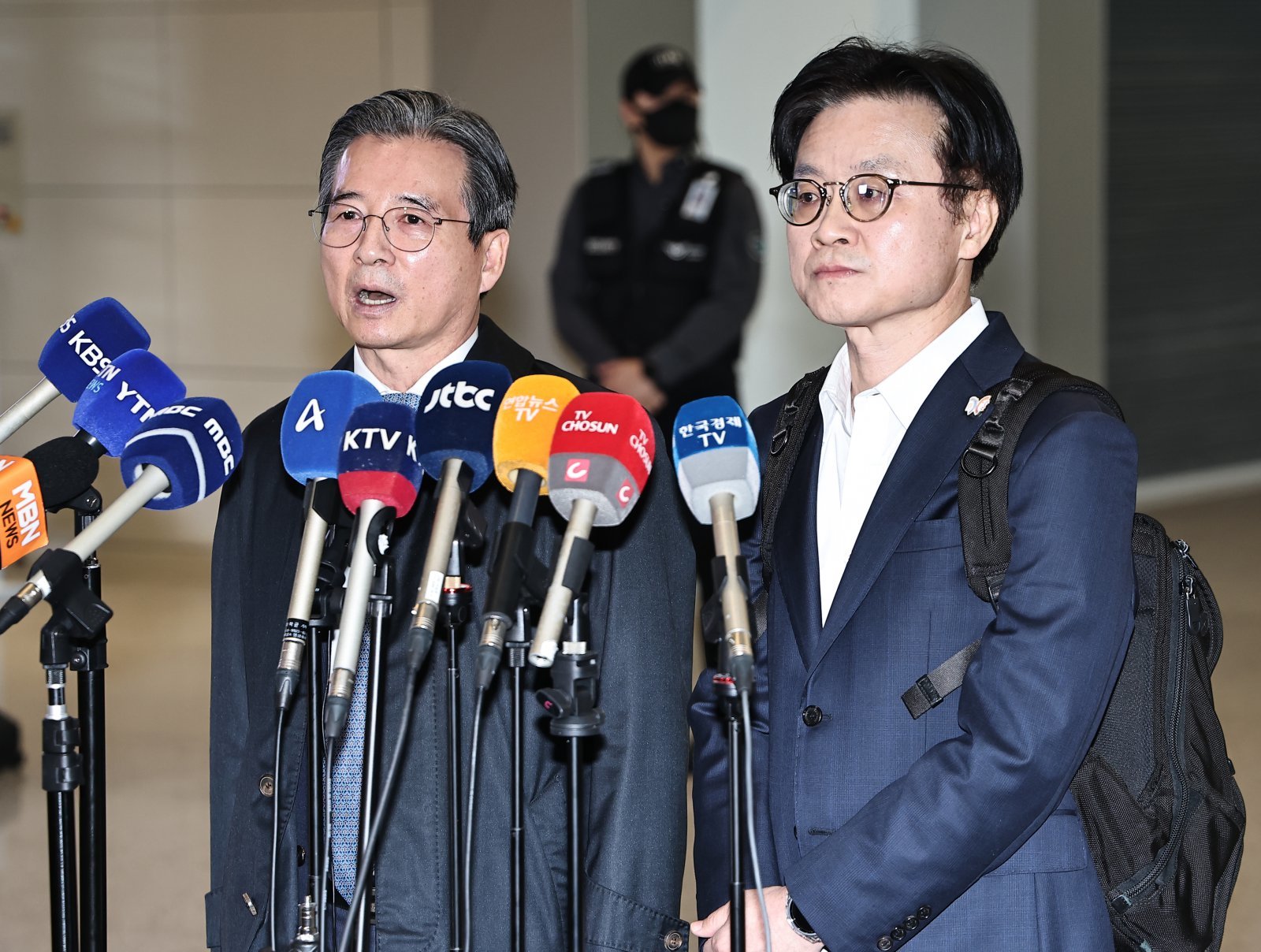 김용범 대통령실 정책실장(왼쪽)과 김정관 산업부 장관이 22일 한미 관세 협상 추가 논의를 위해 인천국제공항 제2여객터미널에서 미국 워싱턴DC로 출국하기에 앞서 인터뷰 하고 있다. 양회성 기자 yohan@donga.com |