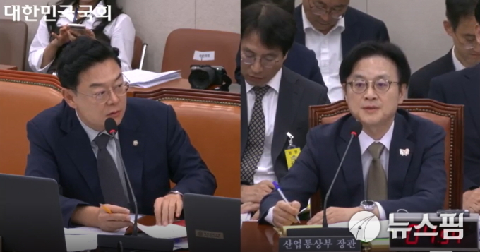 김성원 국민의힘 의원(왼쪽)이 24일 국회 산업통상자원중소벤처기업위원회 국정감사에서 한미 관세협상 관련 김정관 산업통상부 장관에게 질의하고 있다. [사진=국회 의사중계시스템] 2025.10.24 dream@newspim.com |