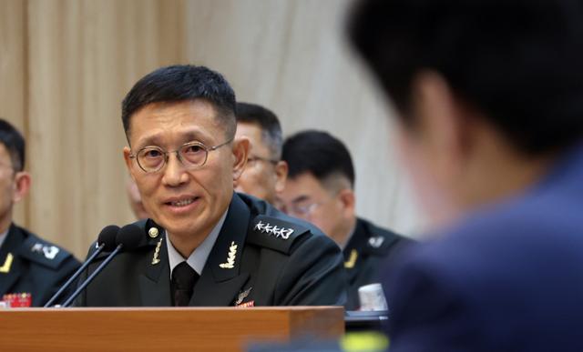 24일 충남 계룡시 계룡대에서 열린 국회 국방위원회의 육군본부에 대한 국정감사에서 김규하 육군참모총장 직무대리가 의원 질의에 답하고 있다. 계룡=뉴시스 |