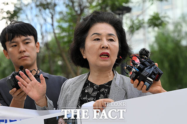 김영선 전 국민의힘 의원이 4일 오전 서울 종로구 KT 광화문 빌딩 웨스트에 마련된 김건희 여서 관련 의혹을 수사 중인 민중기 특별검사팀 사무실로 출석하며 기자회견을 하고 있다. /서예원 기자 |