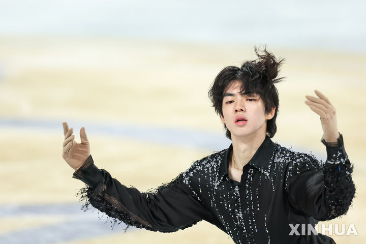 [충칭=신화/뉴시스] 차준환이 24일(현지 시간) 중국 충칭 위둥아레나에서 열린 2025-26 국제빙상경기연맹(ISU) 피겨 스케이팅 그랑프리 2차 ‘컵 오브 차이나’ 남자 싱글 쇼트프로그램에서 연기하고 있다. 차준환은 기술점수(TES) 33.92점, 예술점수(PCS) 41.69점으로 합계 75.61점을 받아 7위를 기록했다. 2025.10.25. |