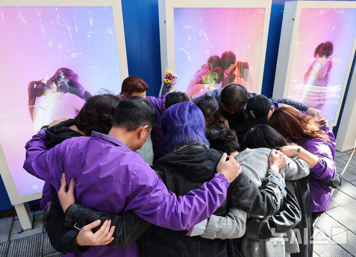 [서울=뉴시스] 배훈식 기자 = 23일 오전 서울 용산구 이태원역 1번 출구 앞 10·29 기억과 안전의 길에서 열린 3주기 빌보드 개막식에서 유가족과 참석자들이 작품 속 아이들처럼 부둥켜 안고 있다. 2025.10.23. dahora83@newsis.com |