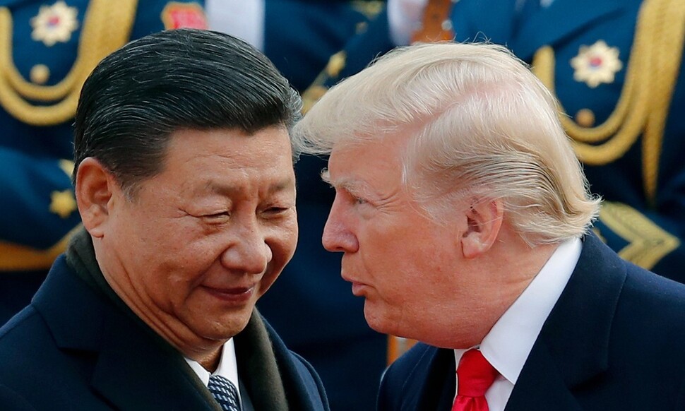2017년 11월 9일 중국 베이징 인민대회당에서 열린 환영식 중 도널드 트럼프 미국 대통령(오른쪽)과 시진핑 중국 국가주석이 담소를 나누고 있다. 베이징/AP 연합뉴스 |