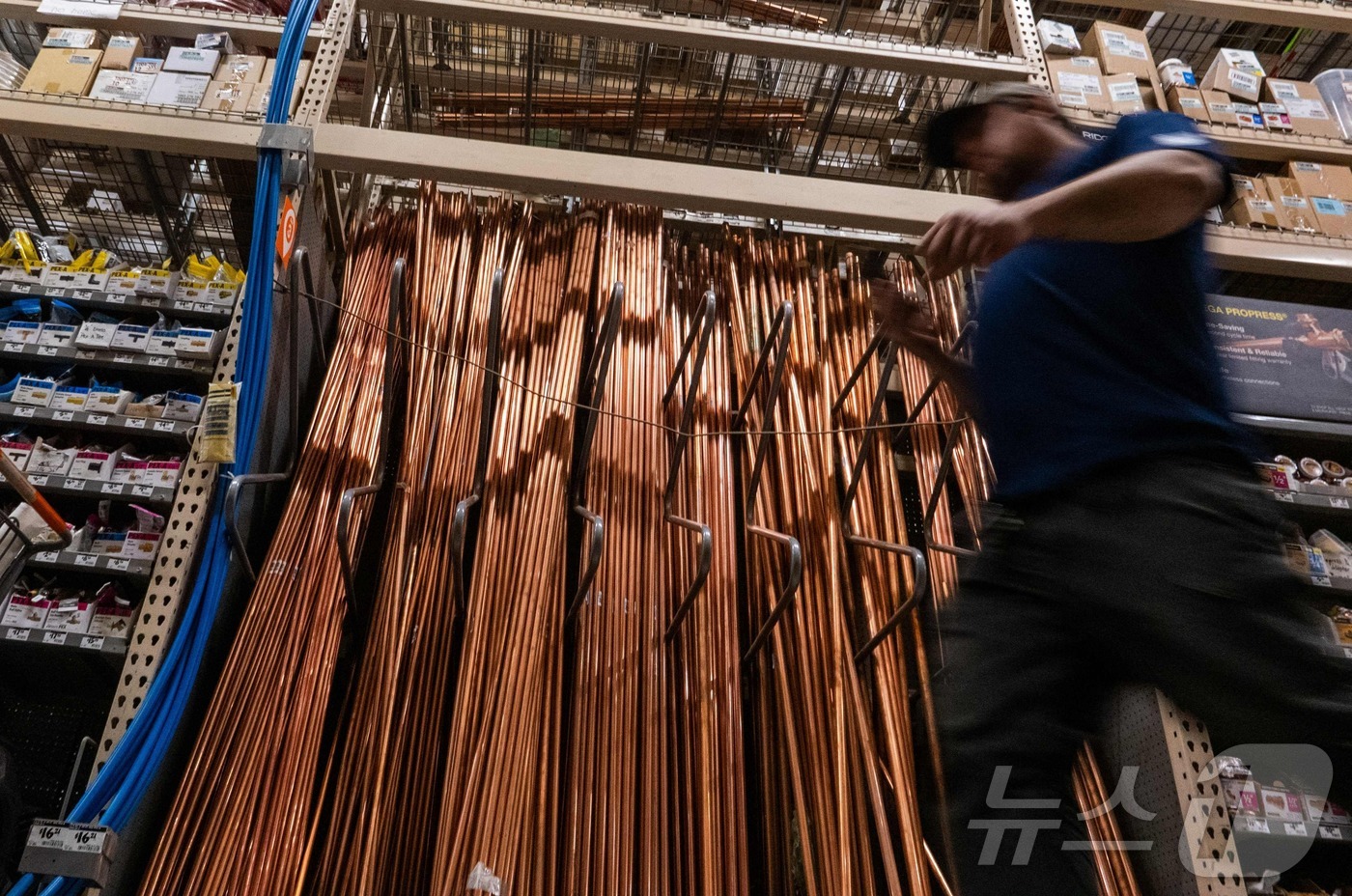 뉴욕시 한 매장에 진열된 구리 파이프/2025.7.9 ⓒ AFP=뉴스1 |