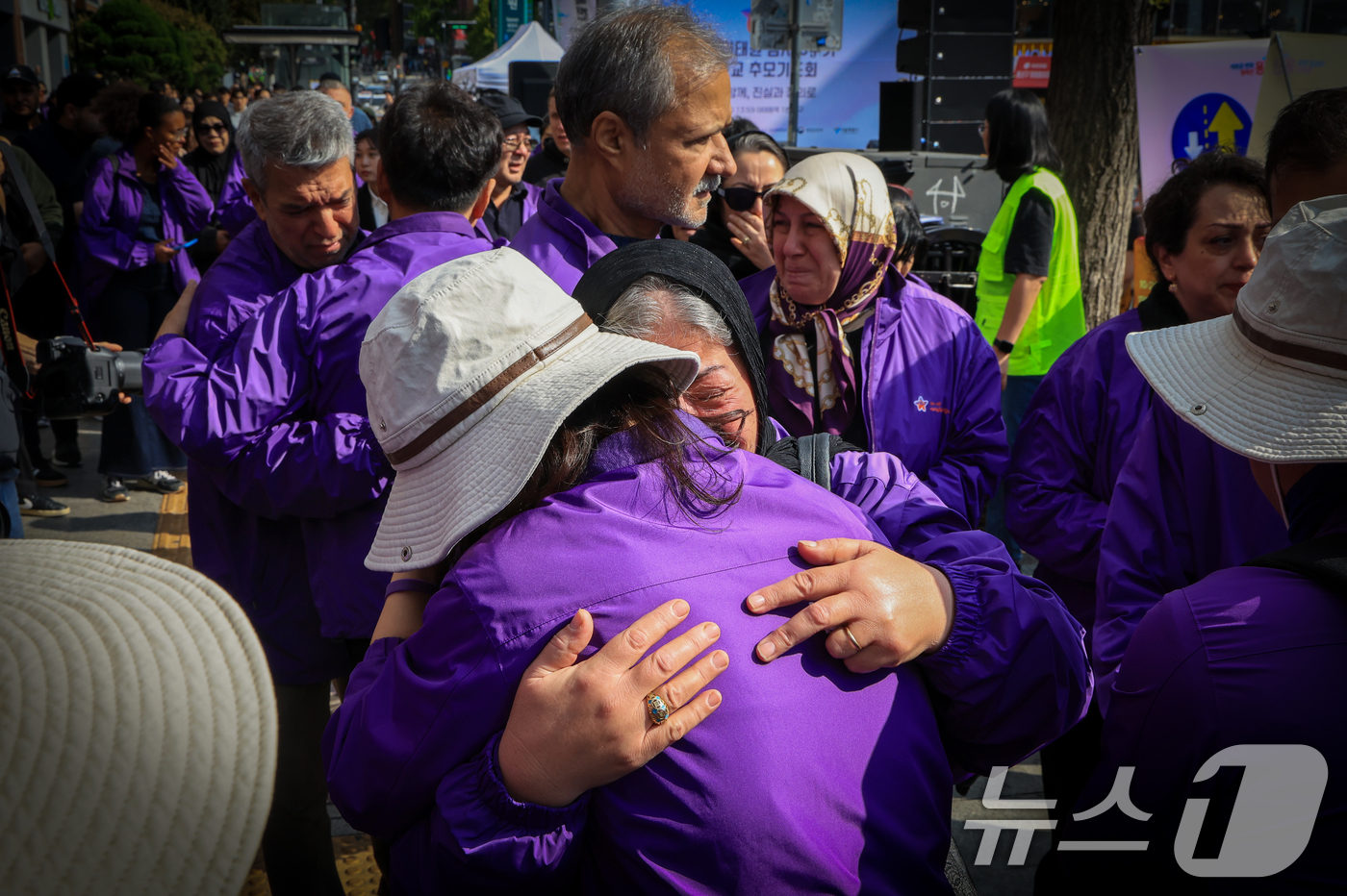 (서울=뉴스1) 이호윤 기자 = 이태원 참사 3주기를 앞둔 25일 서울 용산구 이태원역 1번 출구 앞 ‘10.29 기억과 안전의 길'을 찾은 외국인 희생자 유가족들이 슬픔에 잠겨 있다. 2025.10.25/뉴스1