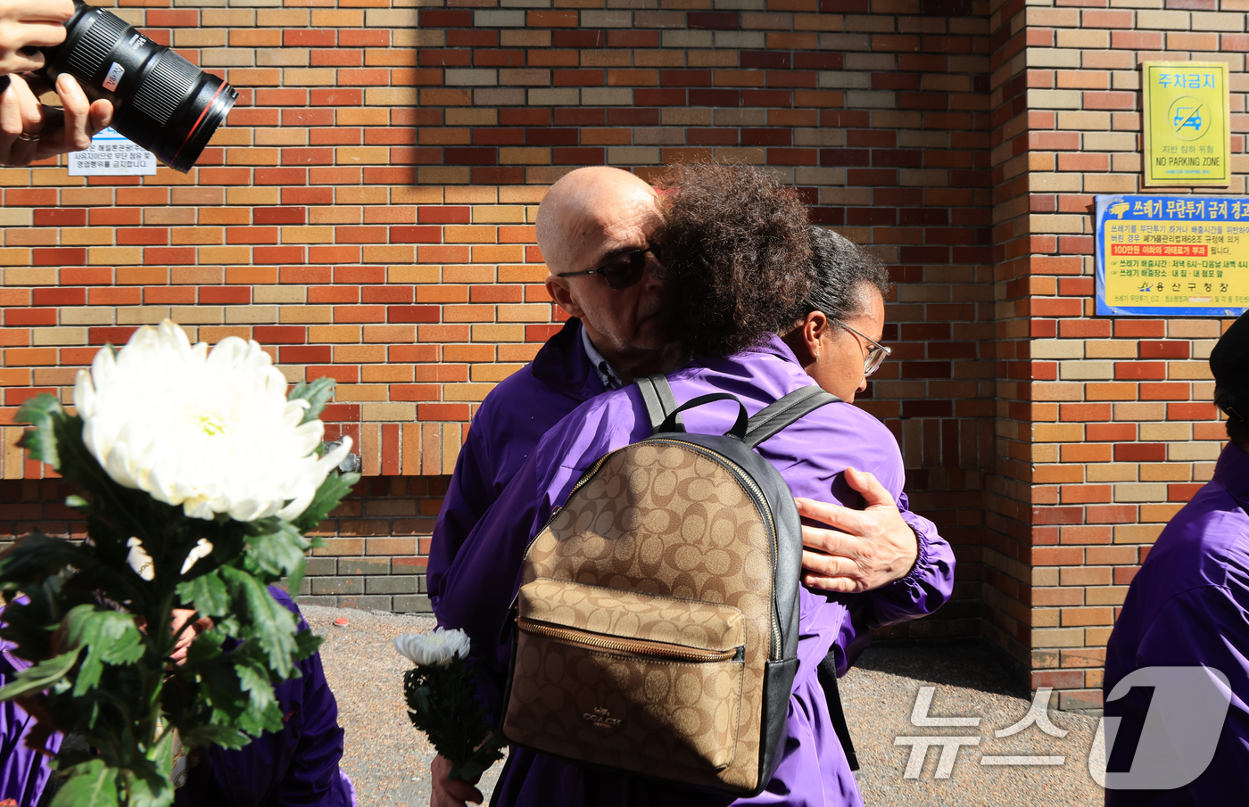 (서울=뉴스1) 이호윤 기자 = 이태원 참사 3주기를 앞둔 25일 서울 용산구 이태원역 1번 출구 앞 ‘10.29 기억과 안전의 길'을 찾은 외국인 희생자 유가족들이 슬픔에 잠겨 있다. 2025.10.25/뉴스1