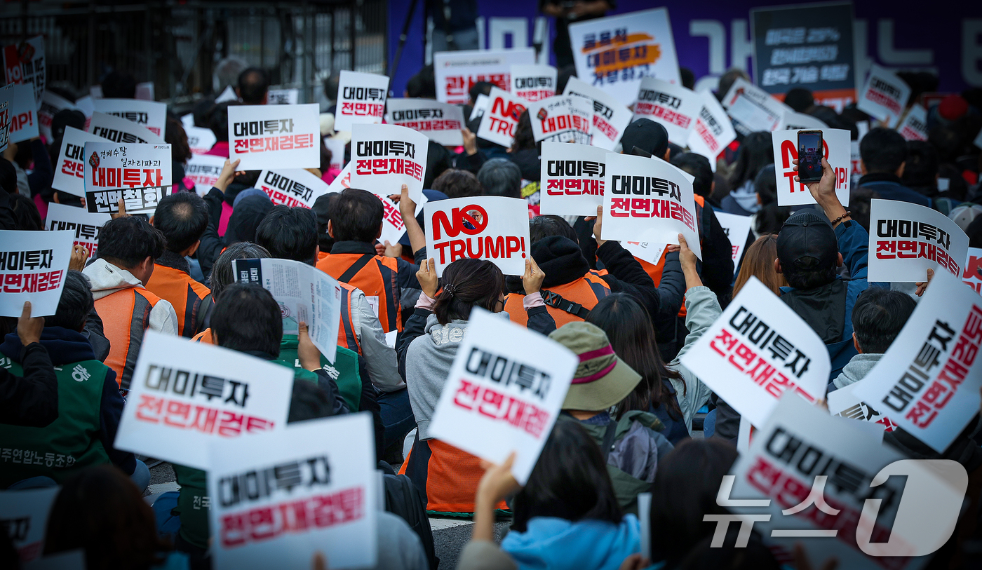 (서울=뉴스1) 이호윤 기자 = 트럼프저지공동행동 회원들이 25일 서울 중구 세종대로에서 열린 대미투자 전면 재검토 NO 트럼프 범시민대행진에 참가해 피켓을 들고 구호를 외치고 있다. 2025.10.25/뉴스1
