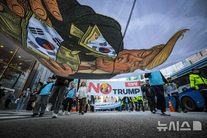 [서울=뉴시스] 정병혁 기자 = 25일 서울 중구 세종대로에서 열린 대미투자 전면 재검토 NO 트럼프 범시민대행진에 트럼프 미국 대통령을 규탄하는 현수막이 놓여 있다. 2025.10.25 jhope@newsis.com |
