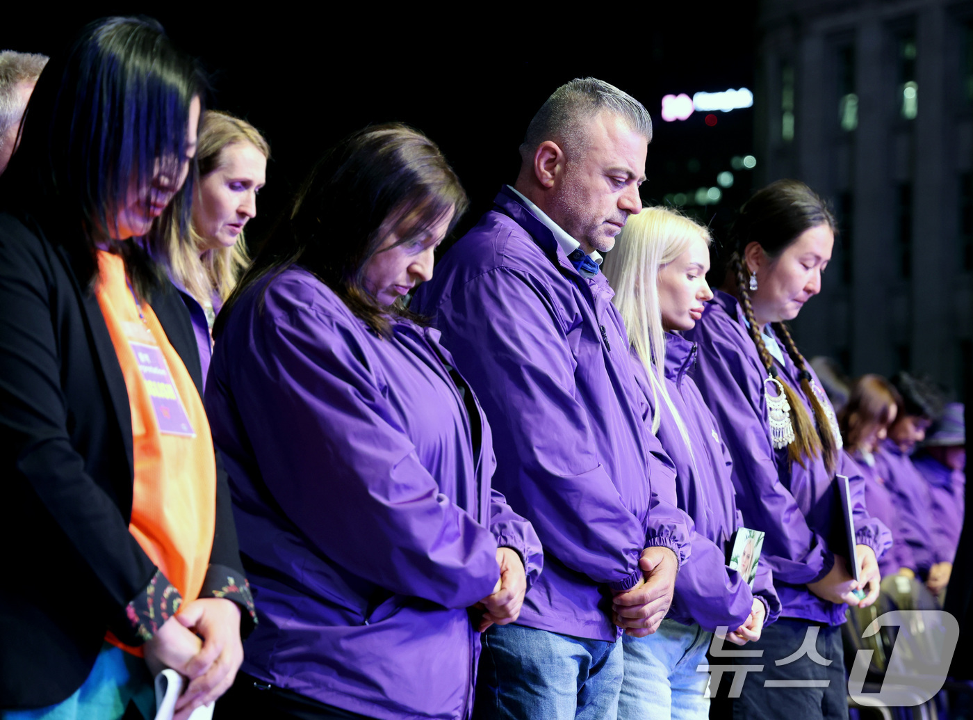 (서울=뉴스1) 이호윤 기자 = 25일 서울 중구 서울광장에서 열린 이태원 참사 3주기 시민추모대회에서 외국인 희생자 유가족들이 묵념을 하고 있다. (공동취재) 2025.10.25/뉴스1