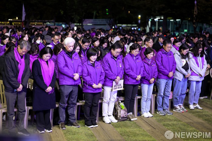 [서울=뉴스핌] 김학선 기자 = 25일 서울 중구 서울광장에서 열린 10.29 이태원참사 3주기 시민추모대회에서 참석자들이 묵념을 하고 있다. 2025.10.25 yooksa@newspim.com