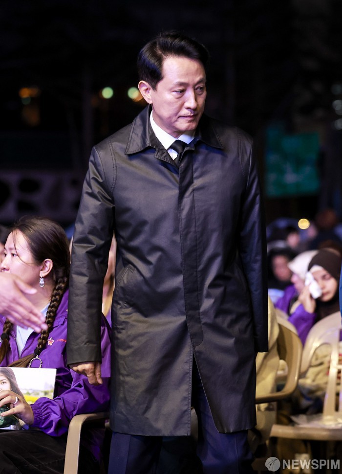 [서울=뉴스핌] 김학선 기자 = 오세훈 서울시장이 25일 서울 중구 서울광장에서 열린 10.29 이태원참사 3주기 시민추모대회에 참석하고 있다. 2025.10.25 yooksa@newspim.com |