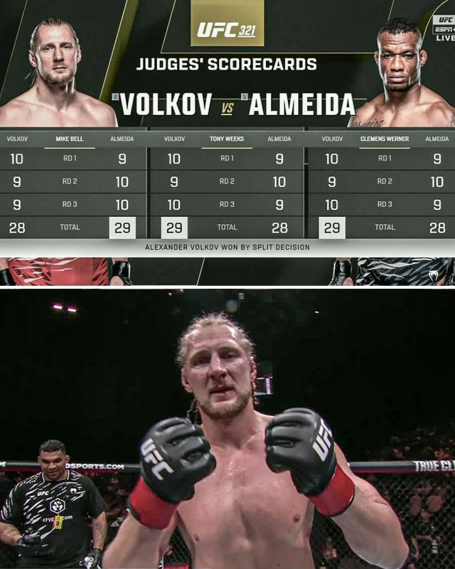 알렉산더 볼코프는 26일(한국시간) 아랍에미리트(UAE) 아부다비 야스섬 에티하드 아레나에서 열린 자일톤 알메이다와의 UFC 321 헤비급 매치에서 3라운드 스플릿 판정 승리했다.