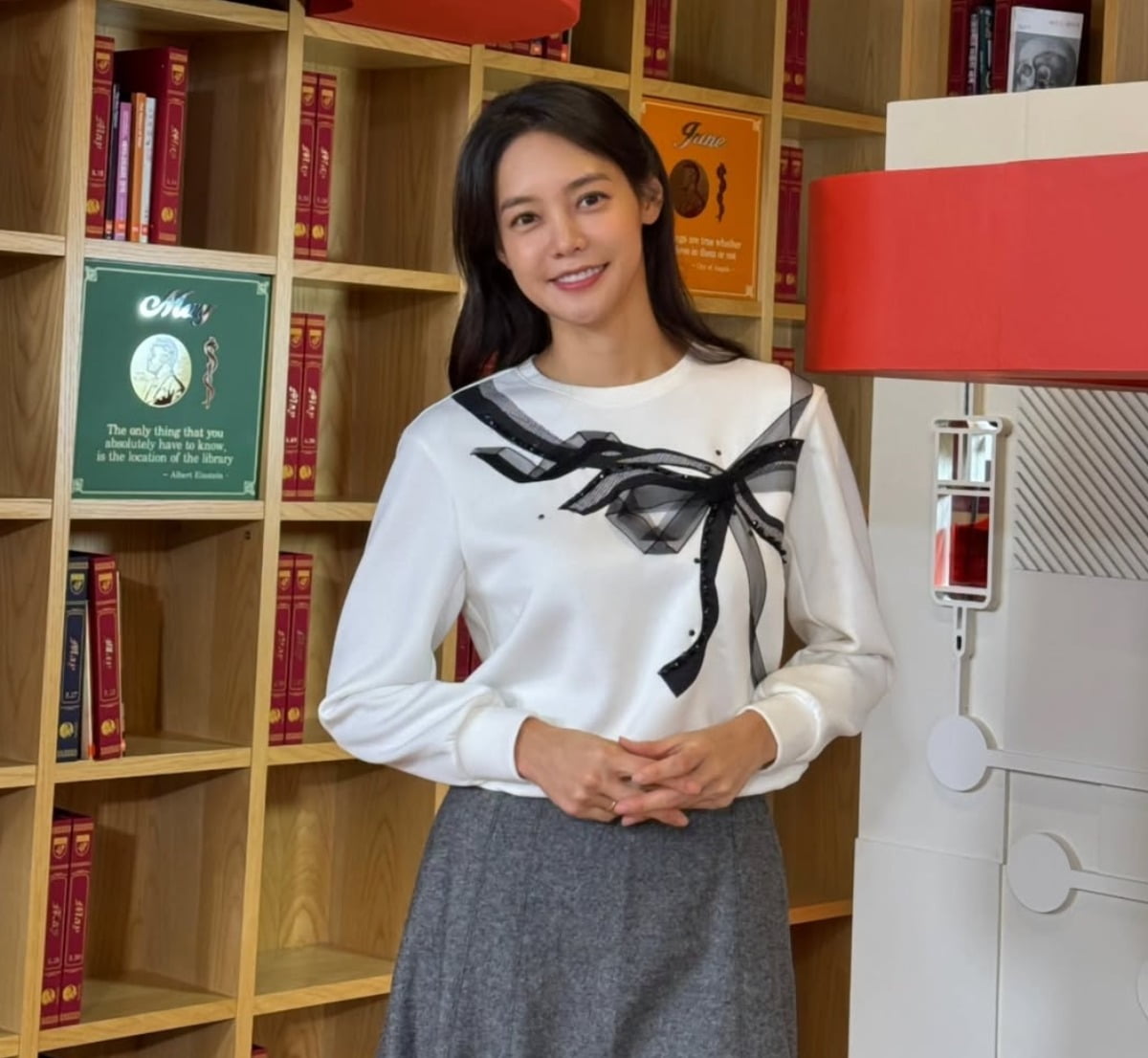 안현모는 흰색 라운드넥 긴팔 티셔츠에 검은색 리본과 스터드 장식이 포인트인 디자인 상의를 착용하고 회색 A라인 미디스커트를 매치해 단정하면서도 여성스러운 스타일링을 완성했다.