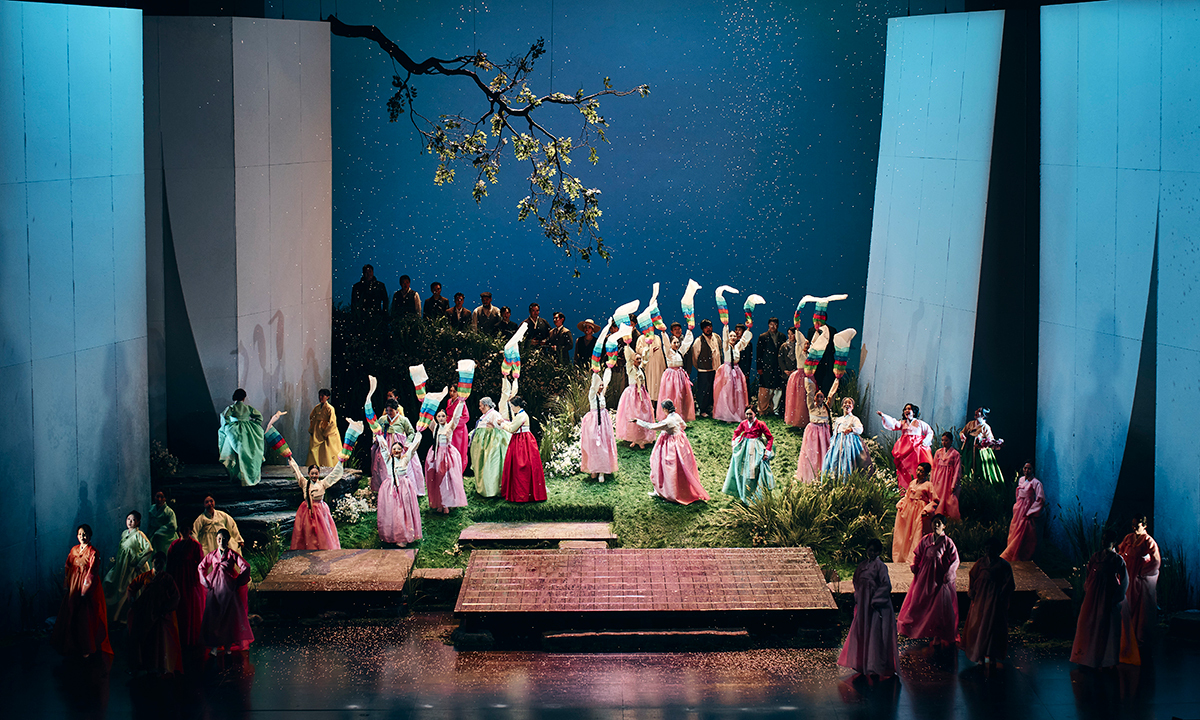국립오페라단 신작 ‘화전가’의 피날레를 장식하는 화전놀이 장면. 1950년 4월, 전쟁이 터지기 두 달여 전 경북 내륙 한 반촌에서 여인들이 꽃을 보며 노래한다. 우리말이 노래가 되고 지나간 세월이 무대로 옮겨지면서 ‘K-오페라’가 탄생했다. 국립오페라단 제공 |