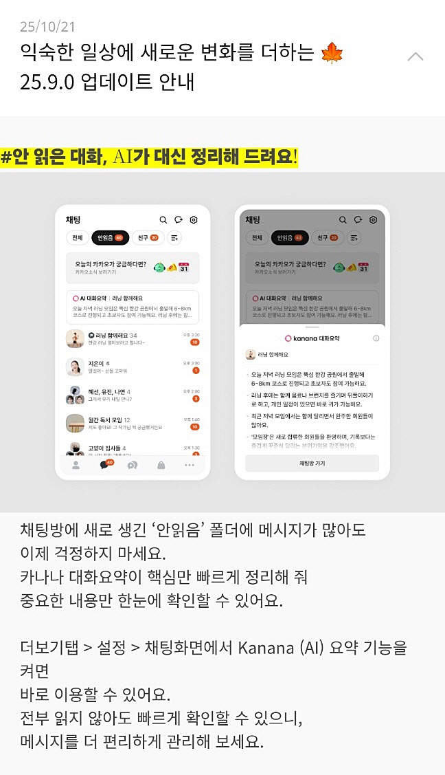 카카오는 지난 21일 공지글을 통해 정규 업데이트 사항에 대해 안내했다. 업데이트에 따라 설정탭 채팅화면에서 ‘카나나(카카오 AI 서비스) 요약 기능’을 켜면 AI가 ‘안읽음’ 폴더에 쌓인 메시지를 요약해 핵심 내용만 정리해준다. 이용자는 메시지를 전부 읽지 않아도 중요한 내용만 확인할 수 있다.