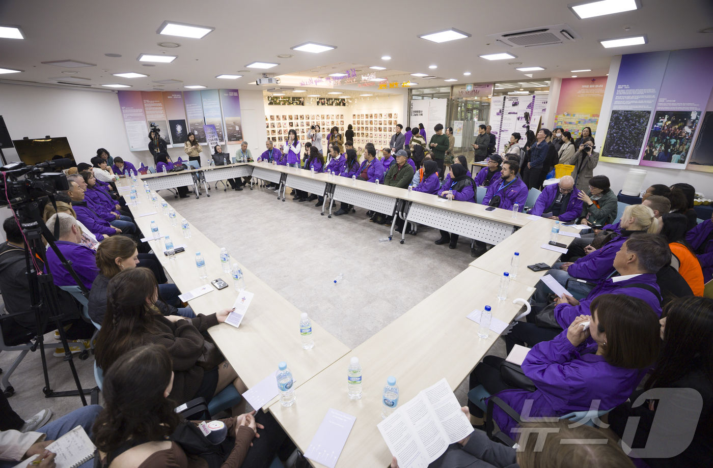 (서울=뉴스1) 김민지 기자 = 송해진 이태원참사 유가족협의회 운영위원장이 26일 오후 서울 종로구 10.29 이태원참사 기억소통공간인 별들의집에서 열린 외국인 희생자 유가족들과의 간담회에서 발언하고 있다. (공동취재) 2025.10.26/뉴스1