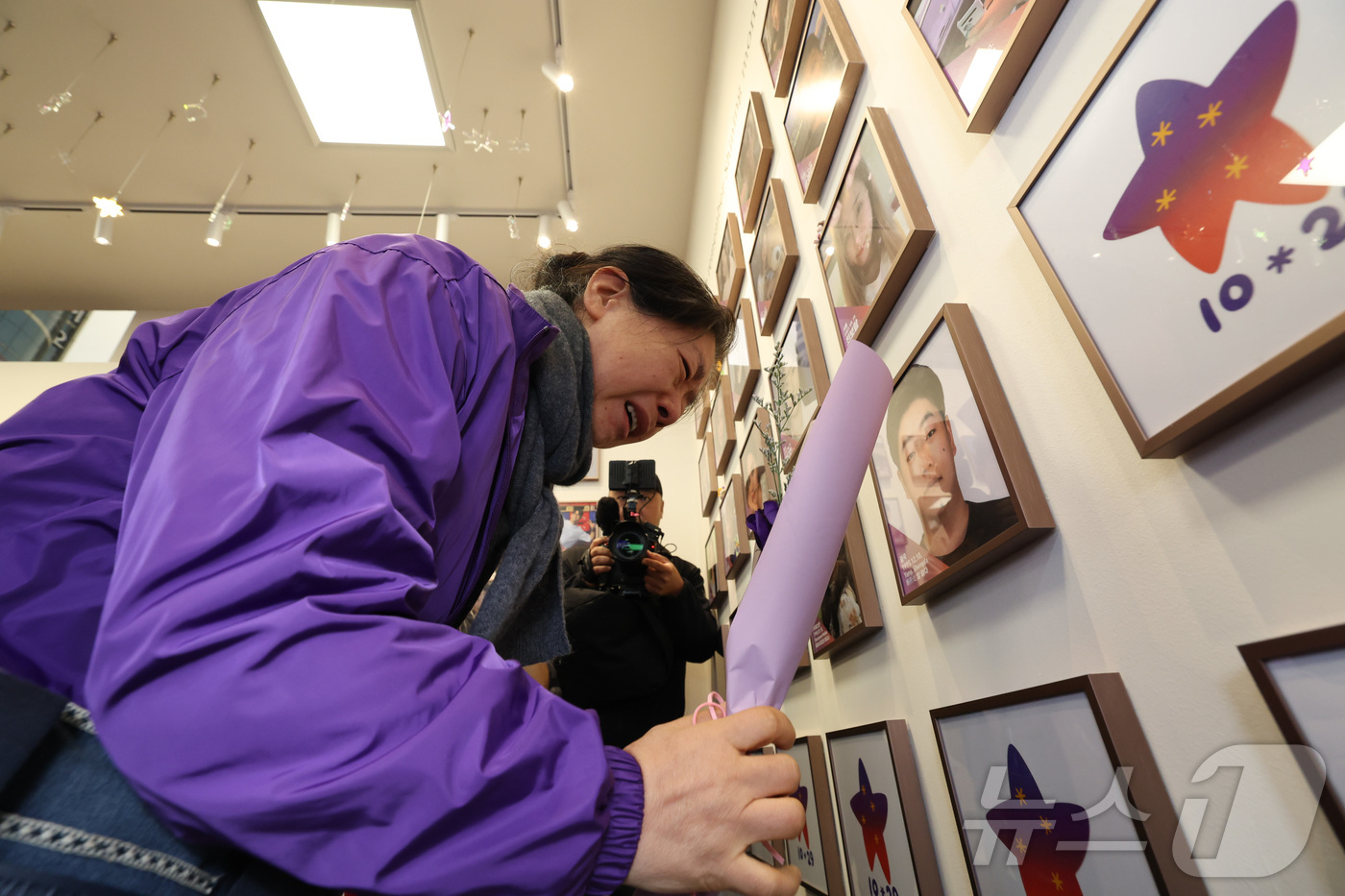 (서울=뉴스1) 김민지 기자 = 10·29 이태원참사 외국인 유가족들이 26일 오후 서울 종로구 별들의 집에 방문, 희생자의 사진을 벽에 걸며 눈물을 흘리고 있다. (공동취재) 2025.10.26/뉴스1