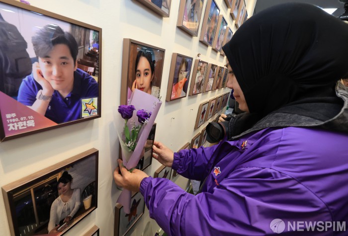 [서울=뉴스핌] 이길동 기자=26일 서울 종로구 별들의집에서 이태원 참사 희생자 외국인 유가족이 고인의 사진을 벽에 걸고 있다.2025.10.26 gdlee@newspim.com