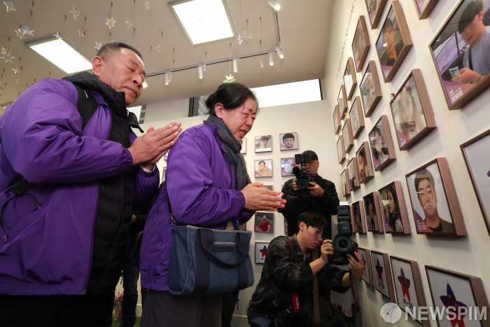 [서울=뉴스핌] 이길동 기자 =10·29 이태원참사 외국인 유가족이 26일 오후 서울 종로구 별들의 집에 방문해 희생자의 사진을 벽에 걸며 눈물 흘리고 있다.2025.10.26 gdlee@newspim.com