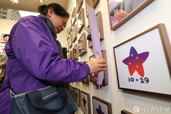 [서울=뉴스핌] 이길동 기자 =10·29 이태원참사 외국인 유가족이 26일 오후 서울 종로구 별들의 집에 방문해 희생자의 사진을 벽에 걸며 눈물 흘리고 있다.2025.10.26 gdlee@newspim.com