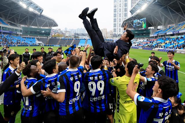 윤정환 인천 유나이티드 감독이 26일 인천축구전용경기장에서 열린 경남FC와의 K리그2 2025 36라운드에서 3-0 완승 후 승격을 확정하자, 선수들의 헹가래를 받고 있다. 뉴스1 |