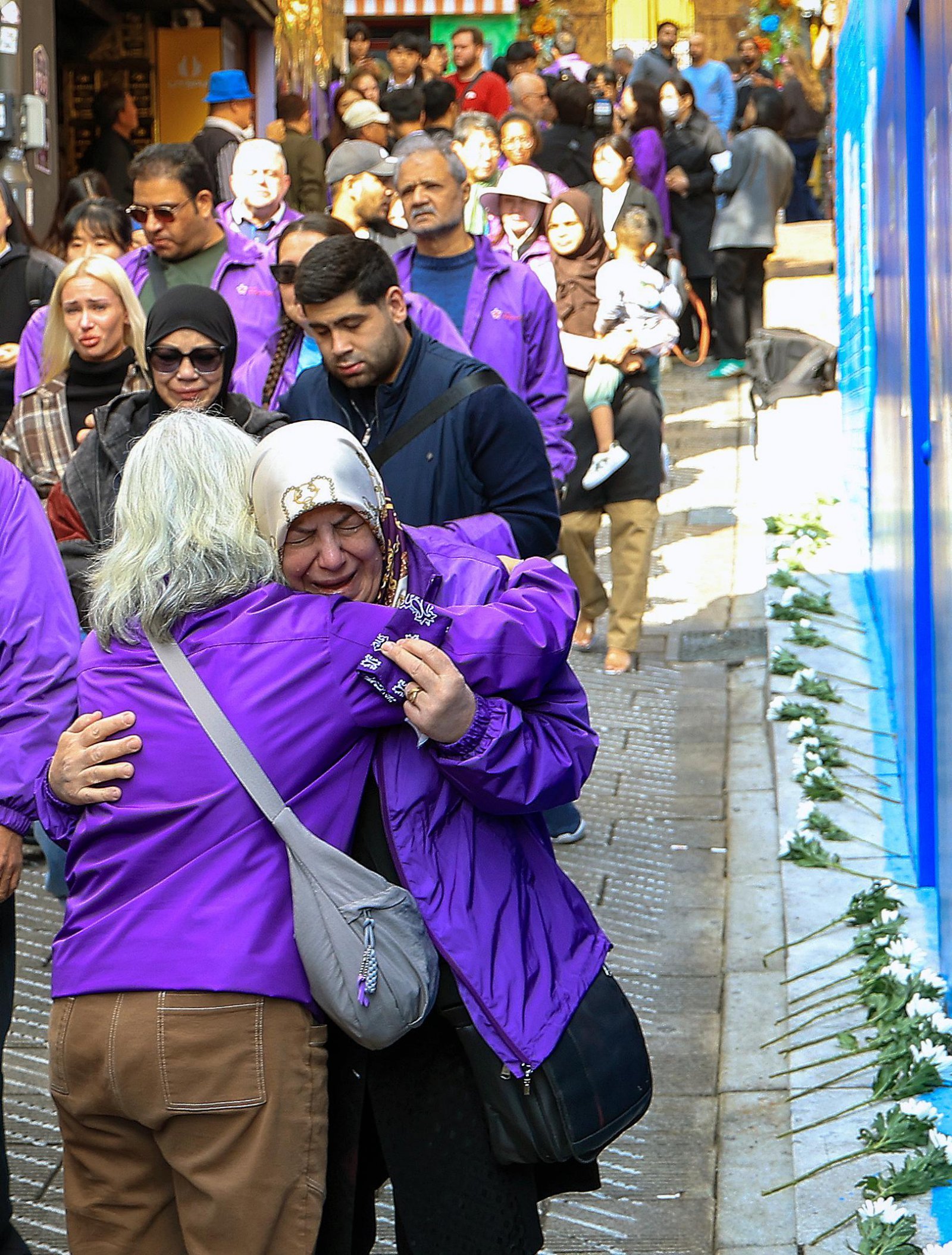 10·29 이태원 참사 3주기를 맞아 25일 현장인 서울 용산구 이태원역 인근 ‘기억과 안전의 길’을 찾은 외국인 희생자의 유족들이 눈물을 흘리며 서로를 위로하고 있다.