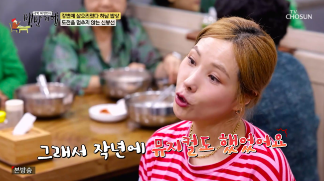 [OSEN=박하영 기자] ‘식객 허영만의 백반기행’ 신봉선이 가수, 뮤지컬 배우에 도전한 이유를 밝혔다.