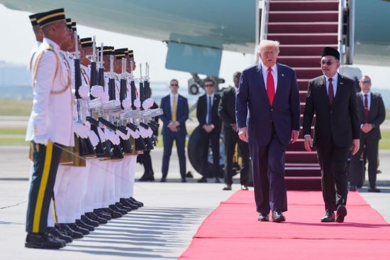 말레이시아를 방문한 트럼프 미국 대통령은 에어포스원에서 내리자마자 안와르 이브라힘 말레이시아 총리가 그를 환대했다. AP연합뉴스 |