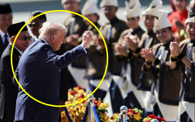 트럼프 대통령은 환영단으로부터 성조기와 말레이시아 국기를 건네받아 마치 ‘와이퍼’처럼 좌우로 흔들어 보이는 제스쳐도 취했다.
