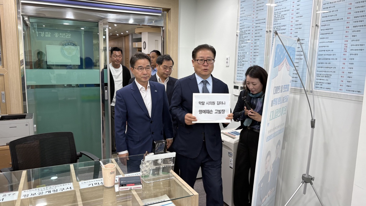 더불어민주당 경남도당이 추석 연휴 김미나 창원시의원의 사회관계망서비스(SNS) 계정에 올라온 글과 관련해 허위사실적시 명예훼손 혐의로 경남경찰청에 고발장을 제출하고 있다. 강승우 기자 |
