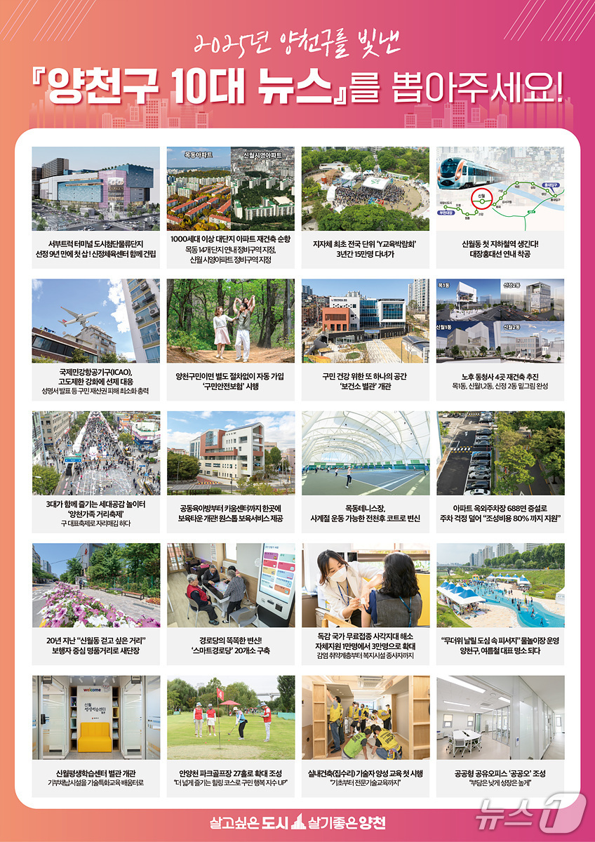 (서울=뉴스1) 한지명 기자 = 서울 양천구는 오는 11월 14일까지 '2025년 양천구 10대 뉴스' 투표를 진행한다고 27일 밝혔다. 한 해 동안 추진된 주요 정책을 되짚어보고, 구정에 대한 구민의 관심을 높이기 위해 매년 시행되고 있다.