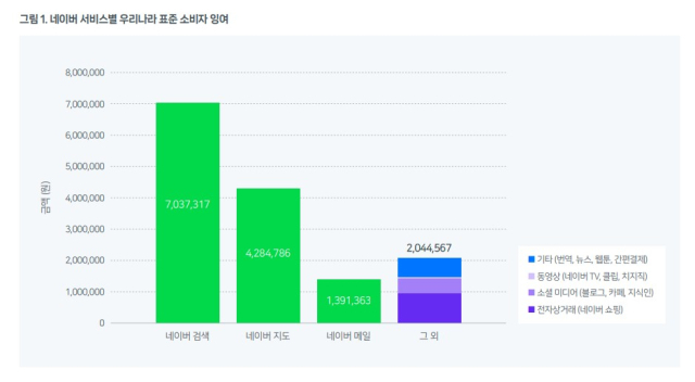특히 연구진은 국내 디지털 사용자들이 하나의 디지털 생태계 안에서 얼마나 다양한 가치를 경험하는지를 종합적으로 파악하기 위해 국내 대표 디지털 플랫폼인 네이버 생태계에도 동일한 방법론을 적용, 국내 디지털 서비스 후생 분석 결과에 네이버의 사용 비중을 반영해 산출했다.