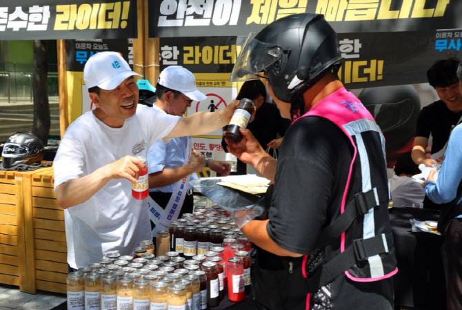 근로복지공단 박종길 이사장(왼쪽)이 지난 7월 서울 역삼역 인근에서 배달라이더들에게 시원한 음료를 나누어 주면서 고용산재보험 거리 홍보를 진행했다.(사진제공=근로복지공단) |