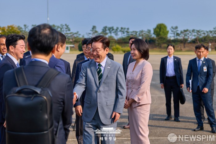 [서울=뉴스핌] 이재명 대통령과 김혜경 여사가 말레이시아 쿠알라룸푸르에서 열리는 아세안 정상회의에 참석하기 위해 지난 26일 경기 성남시 서울공항에서 출국 전 김병기 더불어민주당 원내대표와 악수를 하고 있다. [사진=대통령실] 2025.10.27 photo@newspim.com
