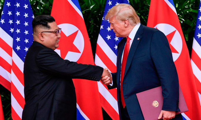 2018년 6월 12일 싱가포르 센토사 섬의 카펠라 리조트에서 만난 트럼프 대통령과 김정은 위원장. AFP연합뉴스 |