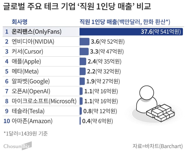 28일 금융 분석업체 바차트(Barchart)에 따르면, 온리팬스는 2024 회계연도에 직원 1인당 3760만달러(약 541억원)를 벌어들였다. 같은 기간 엔비디아는 직원 1인당 360만달러(약 52억원), 애플은 240만달러(약 35억원), 메타는 220만달러(약 32억원), 구글은 190만달러(약 27억원), 마이크로소프트는 110만달러(약 16억원)의 매출을 올렸다. 수십명 규모의 온리팬스가 수만명의 직원을 둔 빅테크보다 10배 이상 높은 효율을 낸 셈이다.