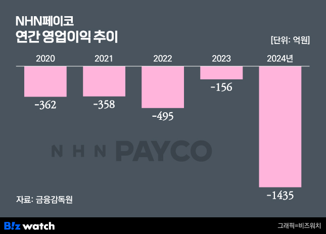 실제 NHN페이코는 설립 이후 지속적으로 적자를 냈다. 이 회사는 2017년에 366억원으로 영업손실을 낸 이후 매년 300억~400억원의 적자를 기록했다. 2023년에는 연간 손실이 100억원대로 줄었지만, 지난해 티메프 사태로 영업손실이 1400억원대로 늘어났다.