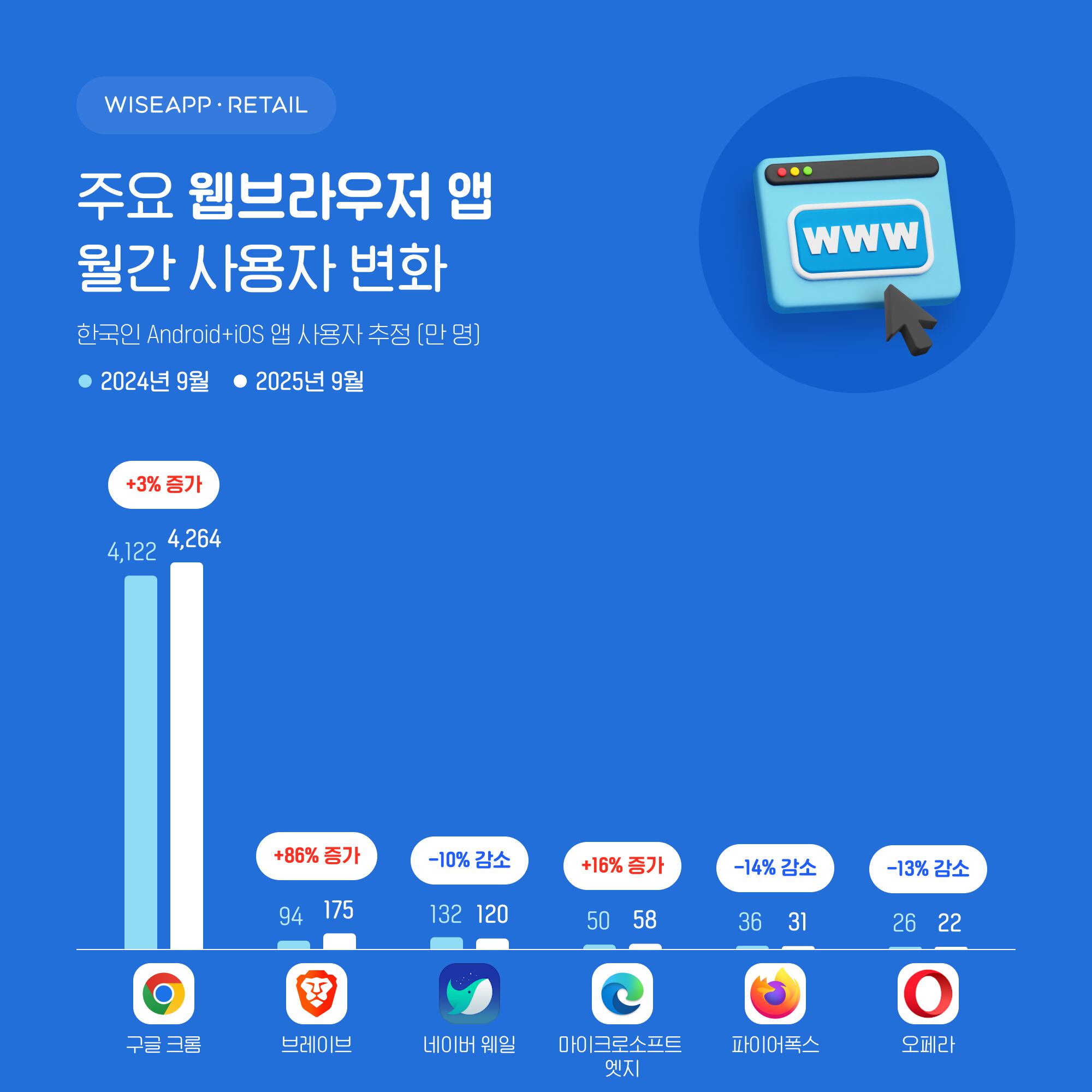 이어서 ▲브레이브(Brave) 175만 명 ▲네이버 웨일(Whale) 120만 명 ▲마이크로소프트 엣지(Microsoft Edge) 58만 명 ▲파이어폭스(Firefox) 31만 명 ▲오페라(Opera) 22만 명 순으로 나타났다.