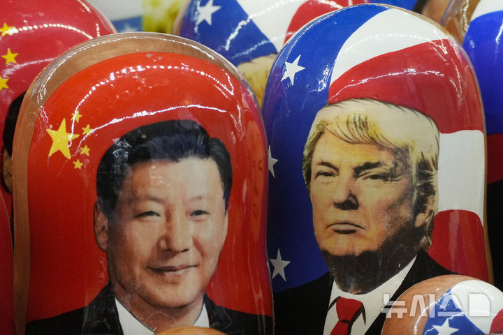 [상트페테르부르크=AP/뉴시스] 지난해 11월21일(현지 시간) 러시아 상트페테르부르크 기념품 가게에 진열된 시진핑 중국 국가주석(왼쪽)과 도널드 트럼프 미국 대통령 마트료시카. 2025.02.04. |
