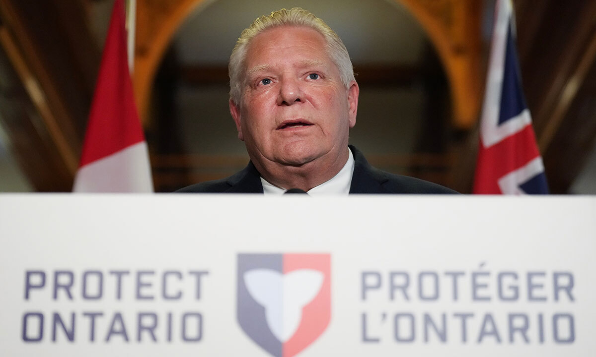 더그 포드 캐나다 온타리오주(州) 총리가 27일(현지시간) 토론토에서 열린 기자회견에 참석해 발언하고 있다. 단상의 테이블에 ‘온타리오를 (미국의 관세 공격으로부터) 지켜내자’라는 구호가 적혀 있다. AP연합뉴스 |