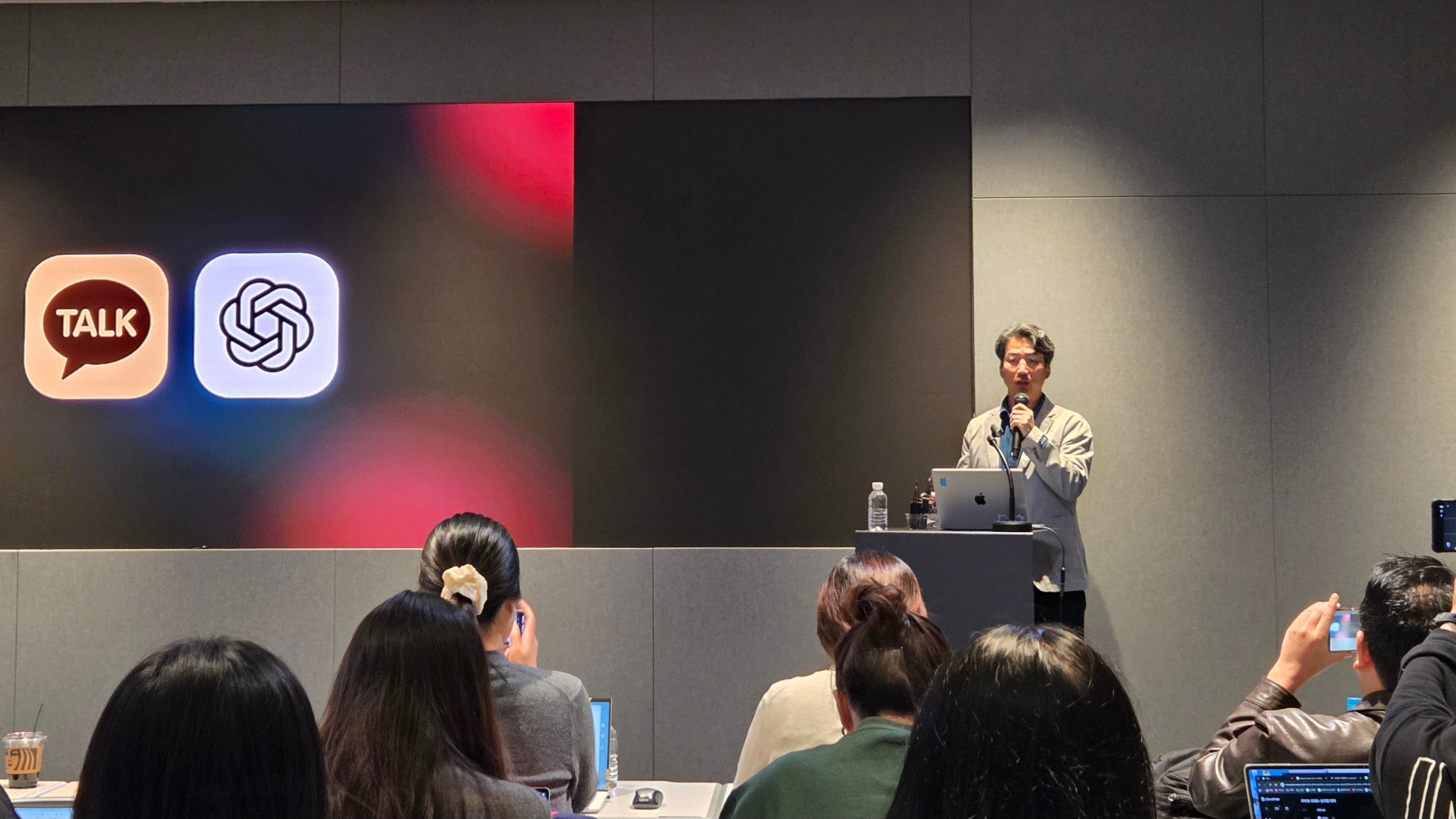 유용하 카카오 AI에이전트 플랫폼 성과리더가 28일 경기 성남 카카오 판교아지트에서 열린 ‘챗GPT for 카카오 출시’ 기자간담회에서 발언하고 있다./심민관 기자 |