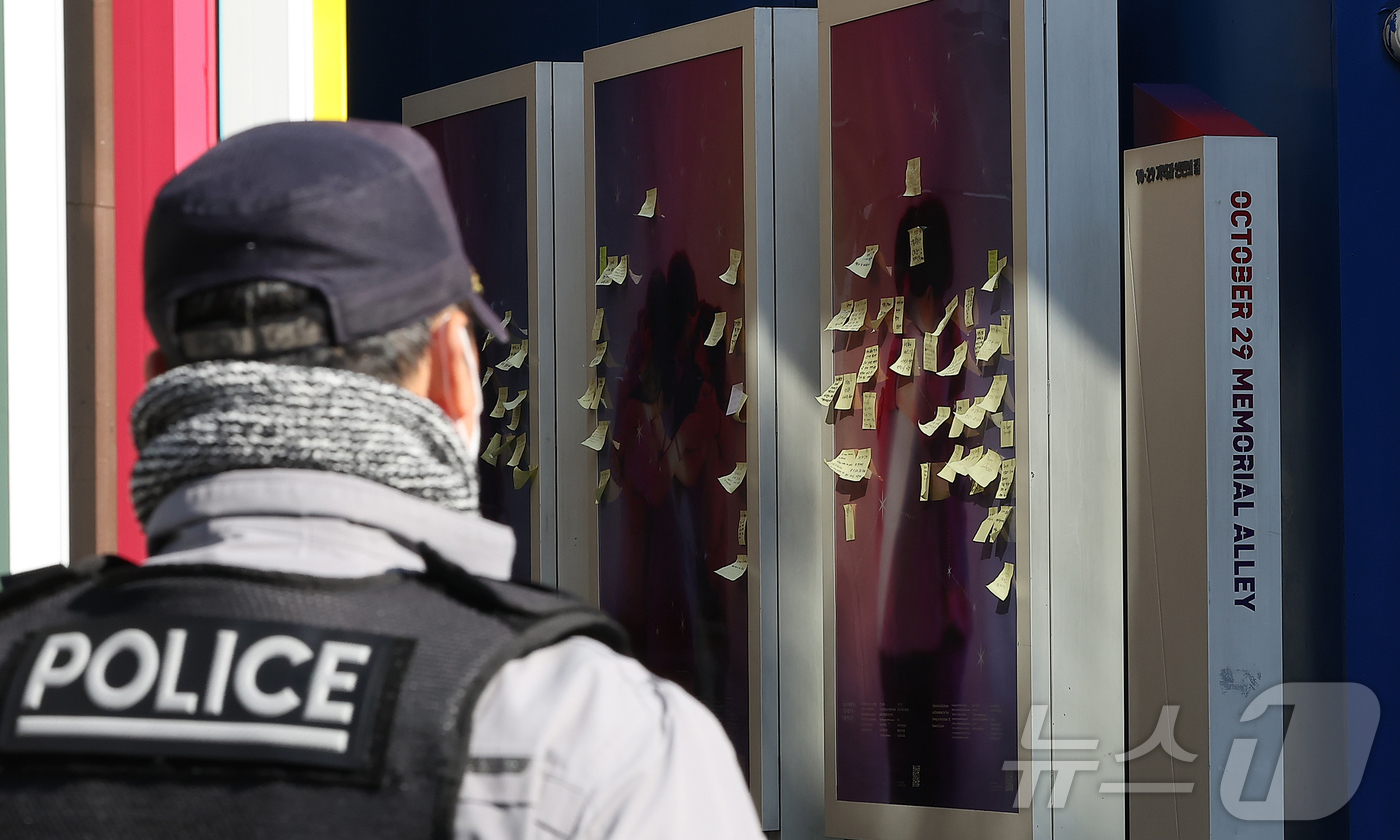 (서울=뉴스1) 김진환 기자 = 10.29이태원 참사 3주기를 하루 앞둔 28일 서울 용산구 이태원참사 골목에 마련된 추모 게시판에 앞으로 경찰이 순찰을 돌고 있다. 2025.10.28/뉴스1