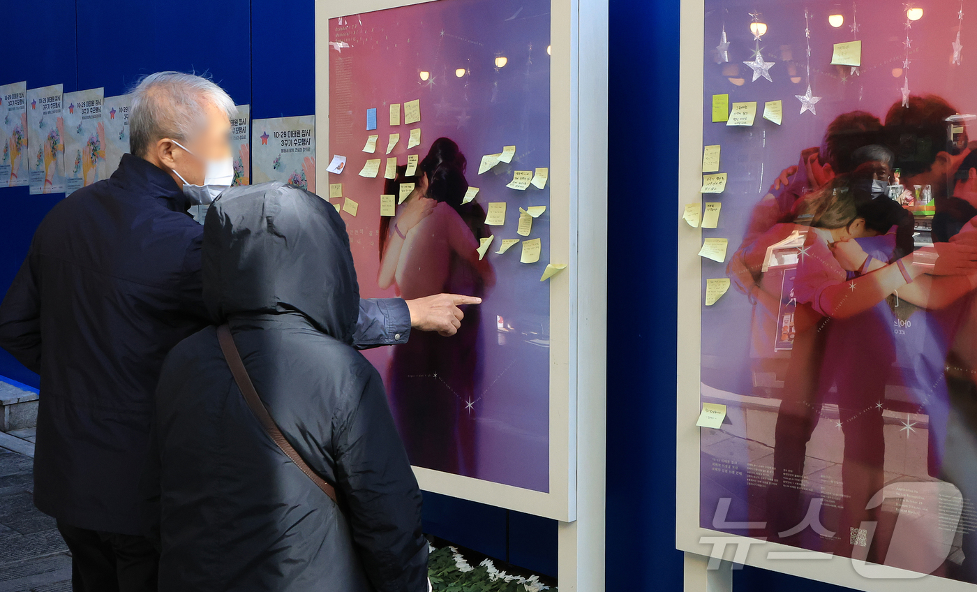 (서울=뉴스1) 김진환 기자 = 10.29이태원참사 3주기를 하루 앞둔 28일 서울 용산구 이태원참사 골목에 마련된 추모 게시판에서 시민들이 추모 메시지를 보고 있다. 2025.10.28/뉴스1
