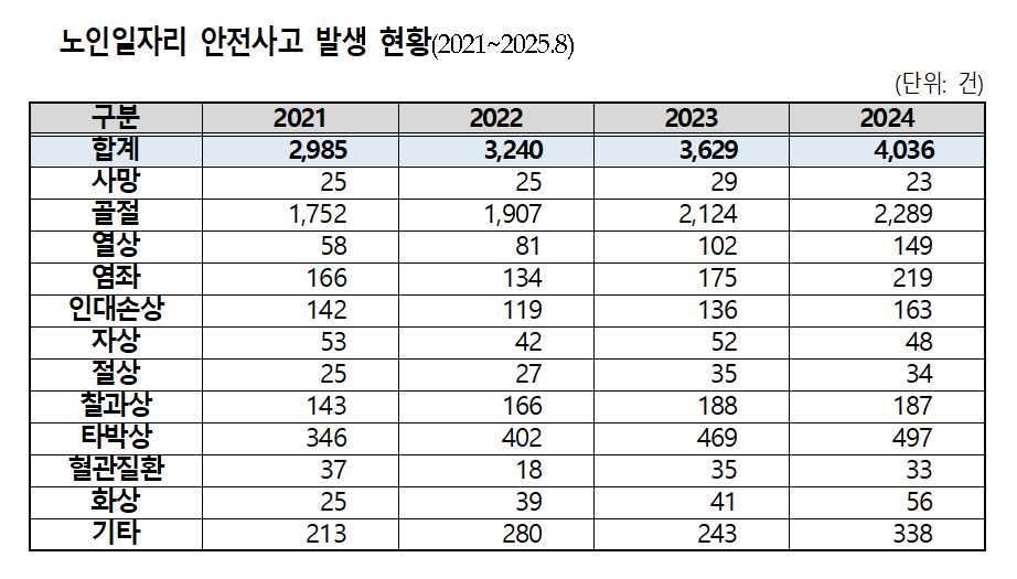 노인일자리 안전사고 2021년 2985건→2024년 4036건, 35% 증가