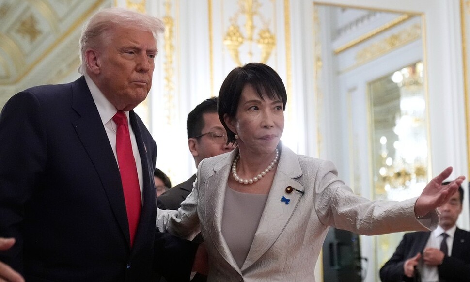 도널드 트럼프 미국 대통령이 28일 일본 도쿄 모토아카사카 영빈관에서 다카이치 사나에 총리의 안내를 받고 있다. AP 연합뉴스 |